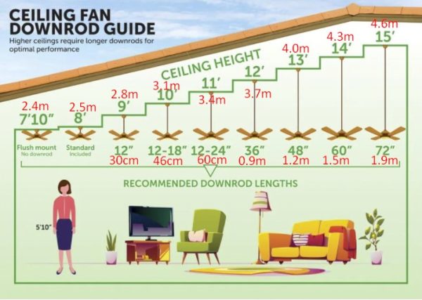 In the UK the standard ceiling height is 7’6″ /2.3m. Decide on whether you need a ceiling fan that is going to be flush mounted, standard short drop-rod or drop-rod with an angle.