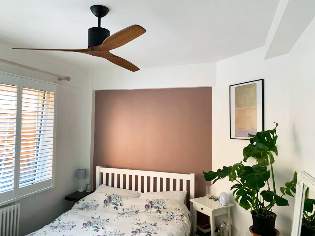 Although the room was quite small 11′ x 11’6″ (3.3 x3.5m) we recommended the 52″ (132cm) diameter MrKen rather than a smaller size so that at night, when every small sound can be heard, that there would be no wind noise whatsoever as it would perform well at slow speed 1 or 2 out of 6. It also gave spare capacity should it ever get to high temperatures in the peak of summer so it could remove the hot air from the room effectively.