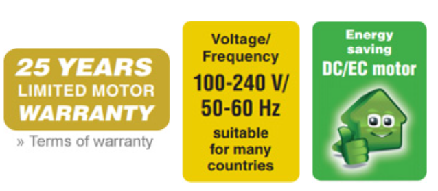 Energy-saving, patented low energy DC/EC direct current motor technology. Max power used is 12.2 w on full speed of 209 rpm.