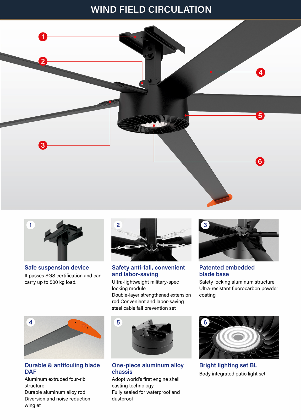Just as with smaller ceiling fans so can HVLS fan models be split into the AC and DC categories. The same benefits of DC DC vs AC ceiling fans apply – a much lower energy consumption typically 150w and 70% less energy like-for-like, better controllability with 6-speed settings and most important a far lower cost of installation. This is because they have far more efficient motors which are smaller, lighter and easier to lift in place using just a ladder – no need to rent an expensive cherry picker! Also they have no special high tension guide wires, no expensive 3-phase voltage or high powered wiring making them much simpler and quicker to install. DC motors are also direct drive and brushless meaning that no large heavy expensive gearbox is needed, no stepped power supply for startup, no overheating issues etc. The diagram to the right depicts a typical AC HVLS industrial fan construction with a large inefficient motor and heavy gearbox.